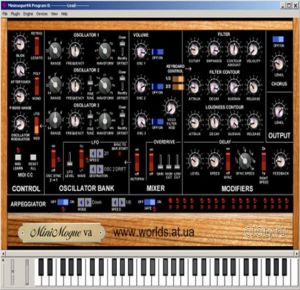 MiniMogueVA 2.1 основан на самом популярном аналоговом синте! Этот софт-синт не только звучит очень похоже на оригинальный Minimoog, но и содержит в себе множество дополнительных функций, включая полифонию в 5 нот, арпеджиатор и 16-ти нотный Step секвенсор, контроллеры Release для двух генераторов контура (огибающие), настройка первого осциллятора, точная настройка для второго и третьего осциллятора, Aftertouch контроль, настраиваемый фильтр кривой Velocity, 3 независимых Овердрайва (по одному на осциллятор), Общий Овердрайв с HiPass и LowPass фильтрами, Oscillator Sync, Хорус, независимый LFO, который включает в себя "drift" осциллятора и стерео-паннинг, полностью программируемый Дилэй. Как и оригинальный minimoog, вы можете настроить LFO третьего осциллятора на модулирование фильтра и Osc Pitch. Здесь нет отдельного генератора шума, но розовый и белый шум доступны в третьем осцилляторе. На все функции присутствует маппинг MIDI CC#. Есть возможность изменить настройки с помощью функции MIDI Learn. Синт можно использовать как отдельное приложение. + ЕТА ВЕРСИЯ ПОЛНОСТЮ БЕСПЛАТНА ТОЛЬКО НА ЕТОМ САЙТЕ!!!